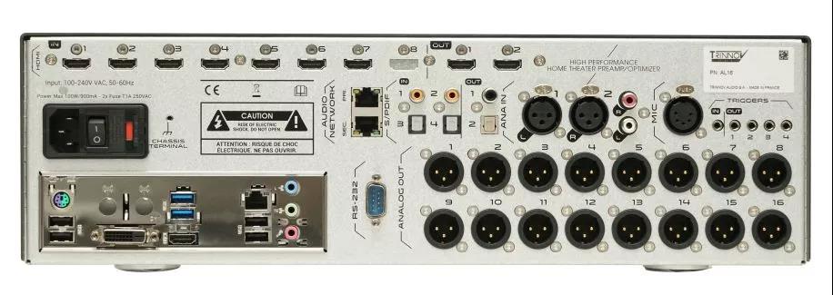 筆者面前正放著 Trinnov 最新鮮出爐的 Altitude 16,顧名思義,就是一款 16 聲道版環繞聲處理器。背板可見,“她”從 Altitude 32 的頂級設計中略了 DB25 連接端口,僅留一對模擬式平衡輸入端口,另留三組同軸/光纖數碼輸入; HDMI 輸入部分,HDMI 1-3 屬于 Low Speed 低速版本,4-7 則屬于 High Speed 高速版本;至于被封住的 HDMI 8,預留日后升級之用;輸出 HDMI 1 不設 ARC (音信回輸功能),HDMI 2 則備 ARC 音效回輸功能。