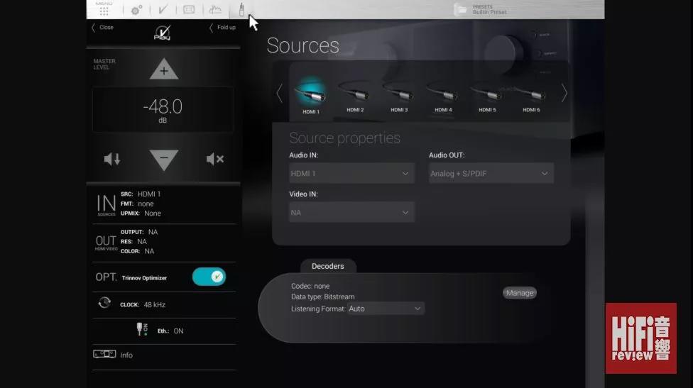 進入版面,只要一click,便可以立即比較使用與不用 Optimization 之別。事實是,Trinnov 沒有明顯的所謂聲底,關掉 Optimization,Trinnov 的高中低頻比例均稱,聲音速度夠高,卻不辣,其特質不會為高頻加入帶美感的泛音,也不尖不鈍;低頻不重不厚不慢也不薄不輕,可以說,沒有什么味道,分析力高而沒有任何浮凸或明顯彰顯個性的特質。開啟后,什么是駐波、什么是反射聲干擾的效果無所遁形,環繞聲的聲音清晰度、立體感、定位立即清晰地呈現出來,還有秩序,即是聲音的穿梭的方向定位;更明顯,是爆破動感強勁而分明,低頻除了有清晰的層次,還有埋身顫動的能量,可以說,環繞效果聲應有盡有,雷聲、暴風雪撲殺而來,還要充滿清晰分明的細節與方位,滿足感瞬間飆升。