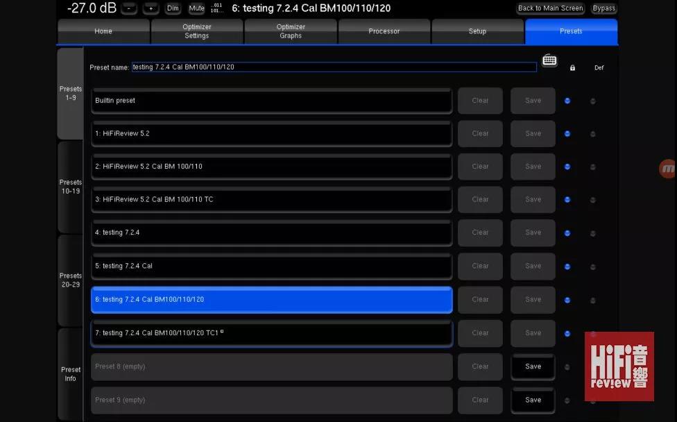 ▲ 你可以儲存多個記設置并自定名稱,如5 – 是只用 Optimization 係的修正效果;6 – 再仔細修正分頻點,如前中置 100Hz,環繞聲 110 Hz,頂置聲道 120Hz;7 – 在 5+6 的設置中,再加入 Target Curve,即個人口味設置,你便可以立即比較不同設置的分別。